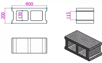 HOLLOW BLOCKS and are commonly used due to their fire rating and sound-absorbing properties. They feature hollow cores for reinforcement bars, water pipes, or electrical wires and come in dimensions of 400 x 200 mm (L x H) with thickness options of 100, 150, and 200mm. These blocks are versatile, offering reduced weight and improved insulation for various construction needs, from load-bearing structures to partition walls.